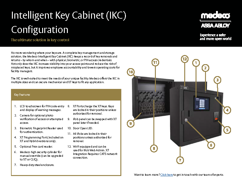 A complete key management and storage solution, the Medeco Intelligent Key Cabinet (IKC) keeps a record of key removals and returns – by whom and when – with physical, biometric, or PIN access credentials. Not only does the IKC increase visibility into your access points and reduce the risk of misplaced keys, but it improves employee accountability and lowers operating costs for facility managers.