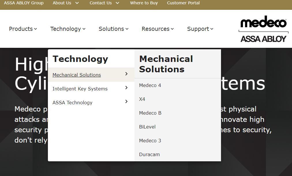 On the “Technology” path, select either Mechanical Solutions or Intelligent Key systems. When you hover over either menu item, all of our technologies will appear. Select the technology you are looking for. On the technology page, scroll down to “Formats” and you will see all of the products available in that technology.