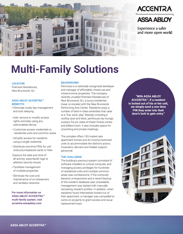 John DeSantis, vice president of Information Technology at Pennrose, said, “The ACCENTRA system has simplified access management for us and saved us considerable time and money. We no longer have to allocate resources to rekey locks when an occupant moves out; in a matter of seconds, we are able to revoke that individual’s credentials. The system also enables us to respond faster to our tenant’s needs. For example, with ASSA ABLOY ACCENTRA®, if a resident is locked out of his or her unit, we simply send a one-time PIN they enter into their door’s lock to gain entry.”