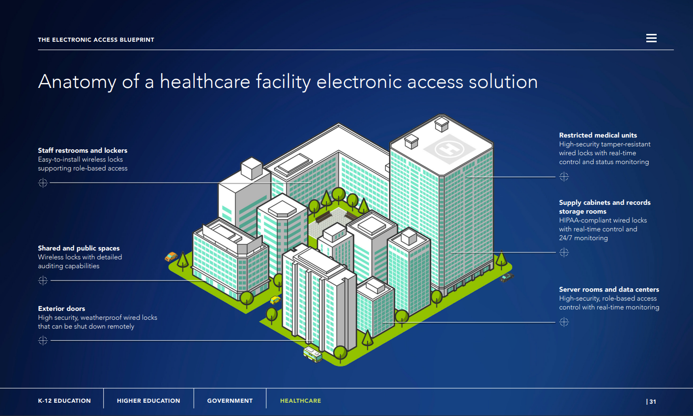 Different facility types face distinct security pressures. Educational institutions must enable movement across campuses while maintaining lockdown readiness. Healthcare facilities require controlled access to sensitive spaces while ensuring clinicians can move quickly and efficiently. Government and regulated buildings operate under strict standards that demand accountability, auditability, and secure credential integration.