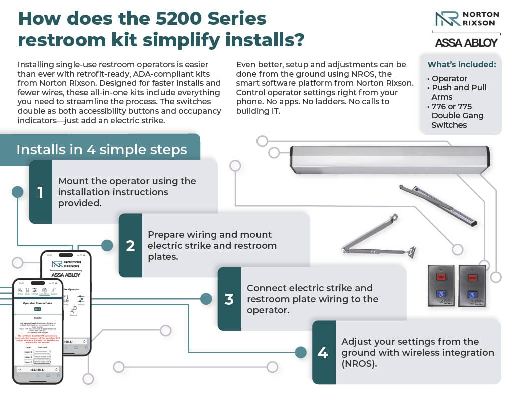Here’s how it works: First, mount the operator using the included instructions. Then, wire the electric strike and restroom plates. Connect them to the operator, and finalize everything using NROS—the smart, wireless platform that eliminates the need for ladders, apps, or IT support from Norton Rixson. Adjustments can be made straight from a mobile device at ground level, saving time and streamlining setup.